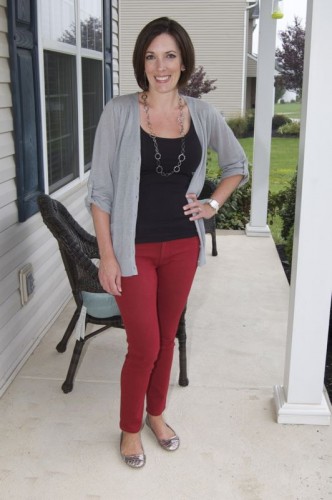 What Jo-Lynne Wore: I wore this on Sunday to church. Gray 3/4-sleeve cardi from GAP Factory Outlet, black tank from Banana, and red DL 1961 jeans from a local boutique. Silver ballet flats and a long silver necklace complete the ensemble!