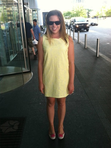 What Jenny Wore: Sunglasses are Ray-Ban Original Wayfarers in Tortoise Shell, $200, purchase here. The dress is from H&M (also comes in pink!) and is now on sale for $15 and shoes are Ferragamo “My Charm” pumps. (Available in fall colors now at Nordstrom’s, Neiman Marcus, Saks).