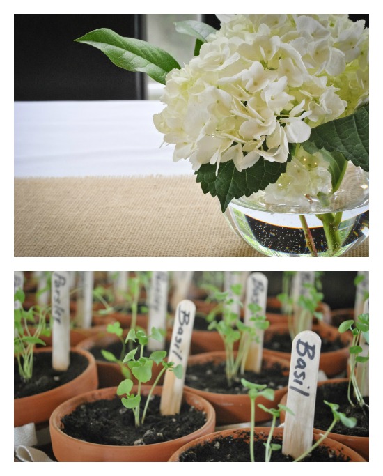 The centerpieces were simple burlap on white tablecloths with gorgeous hydrangea bouquets and each guest was sent home with a potted herb of their choice. A perfect favor from a party celebrating a couple that makes some of the most amazing food.