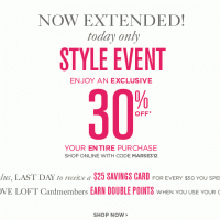 Today only, receive 30% off your entire LOFT purchase as well as free shipping. PLUS, get $25 to spend on a future $50 purchase. And wait! There's more! If you're a LOFT card member, you can earn double points. See site for details. … [Read more...]